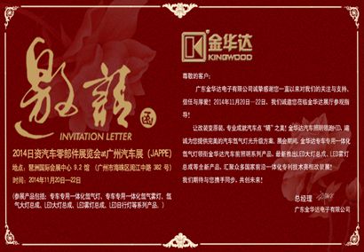廣東金華達電子有限公司誠摯感謝您一直以來對我們的關注與支持、信任與厚愛!2014年11月20日-22日,我們誠邀您蒞臨金華達展廳參觀指導!讓改裝變原裝,專業成就汽車點;睛之美!金華達汽車照明領跑HID,竭誠為您提供完美的汽車氙氣燈光